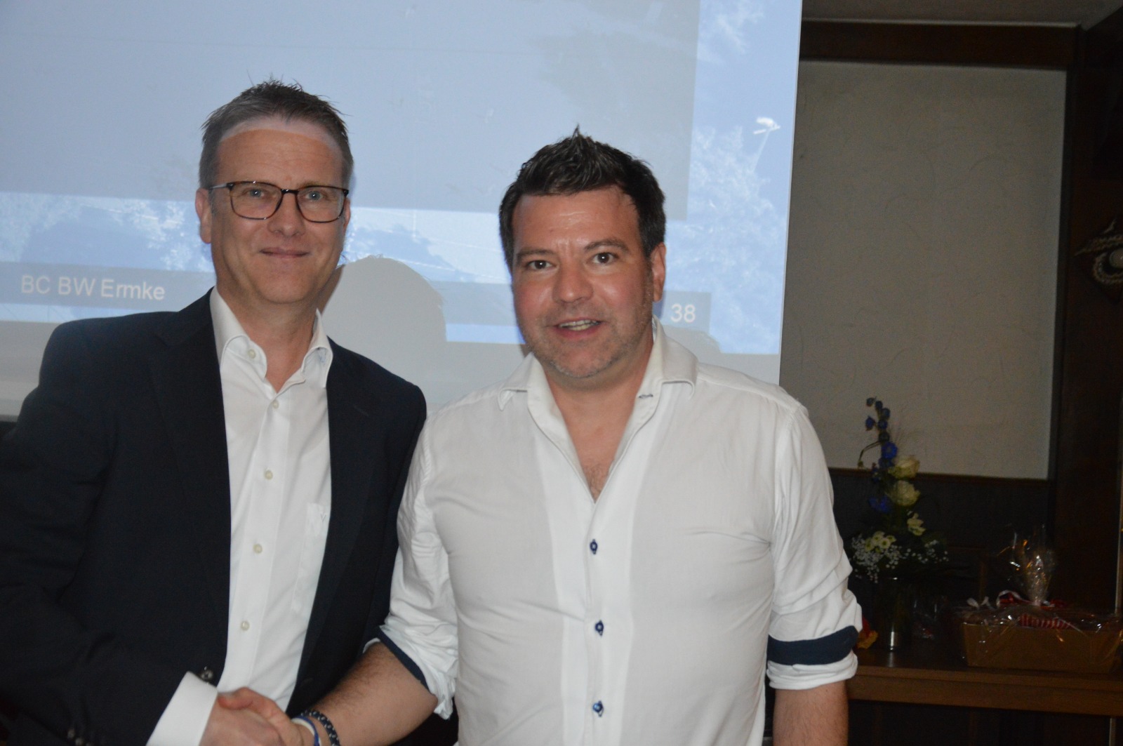 Ermke (la) – „Ich habe 47 wunderschöne Jahre im BC Ermke – ob als Spieler, Trainer, Betreuer, Kassenwart oder die letzten acht Jahre als Vorsitzender – genießen können. Aber alles hat seine Zeit“, erklärte Stefan Bley (links im Bild), bevor er nicht wieder für den Posten als 1. Vorsitzender kandidierte. Die rund 50 Mitglieder, die zur Generalversammlung in den Gasthof Schnieder gekommen waren, spendeten Bley langanhaltenden Beifall und wählten ihn zum Ehrenvorsitzenden. Neuer Vorsitzender wurde dann Dirk Assmann (rechts im Bild), der bisherige Schriftführer. Neu in den Vorstand rückte Tobias Dröge als Schriftführer.